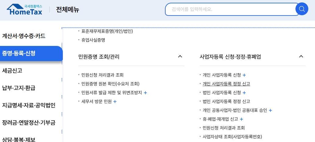 3. “사업자등록 신청, 정정, 휴폐업” 메뉴 선택