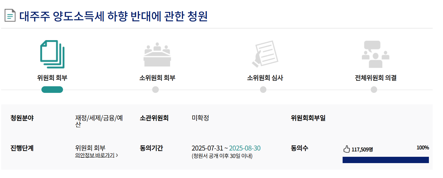 현재 대주주 양도소득세 요건 완화 조항을 수정해달라고 하는 국민 청원이 진행중입니다.